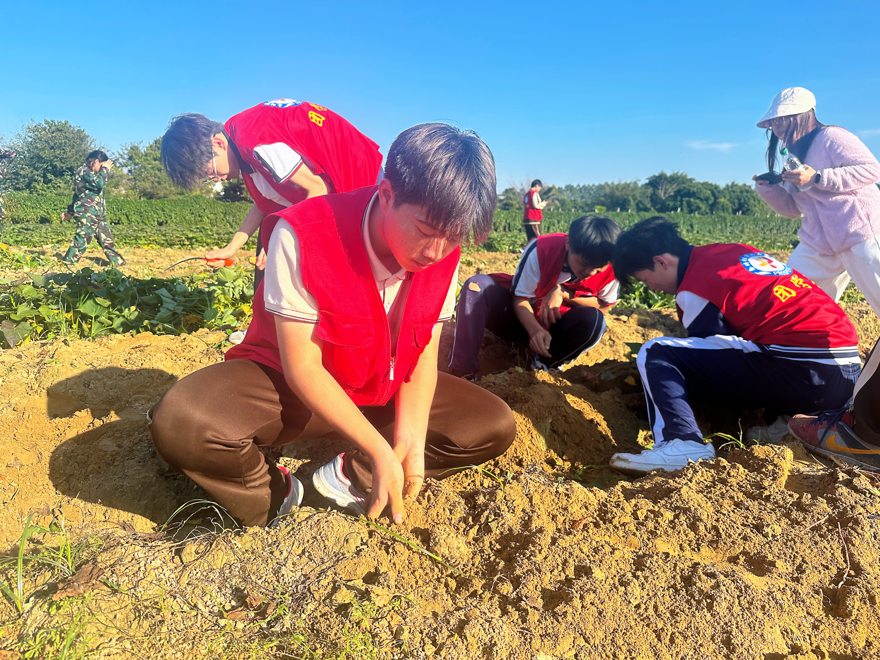 淮山農(nóng)業(yè)公園的紅薯地眼下正迎來收獲季。“到了紅薯收獲時節(jié),得知該村人手緊張、農(nóng)活繁重,結(jié)合學(xué)!凶叩乃颊n’,我們組織黨員、團(tuán)員開展了這場志愿活動!被葜菔胁┵惣脊W(xué)校黨支部副書記、校長助理陳妙玲介紹,這場別樣的思政課在發(fā)起時就得到大家踴躍支持。