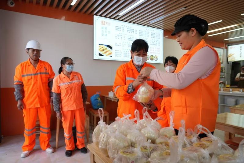 麥尚粗糧生煎包粥鋪為環(huán)衛(wèi)工人提供愛心早餐。