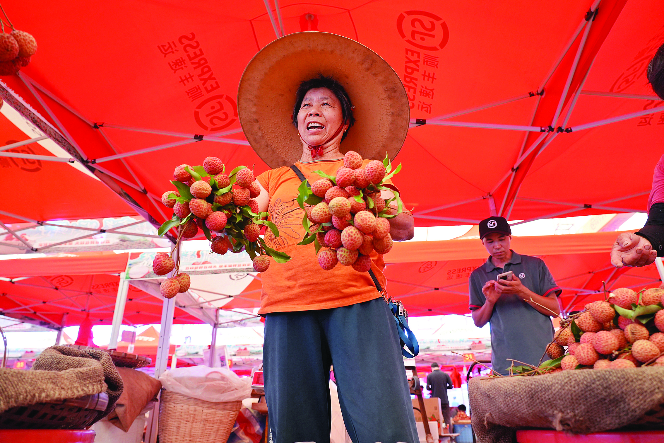 果農(nóng)在RCEP廣東惠州(鎮(zhèn)隆)荔枝交易中心叫賣早果;葜萑請笥浾咴S文昌 攝