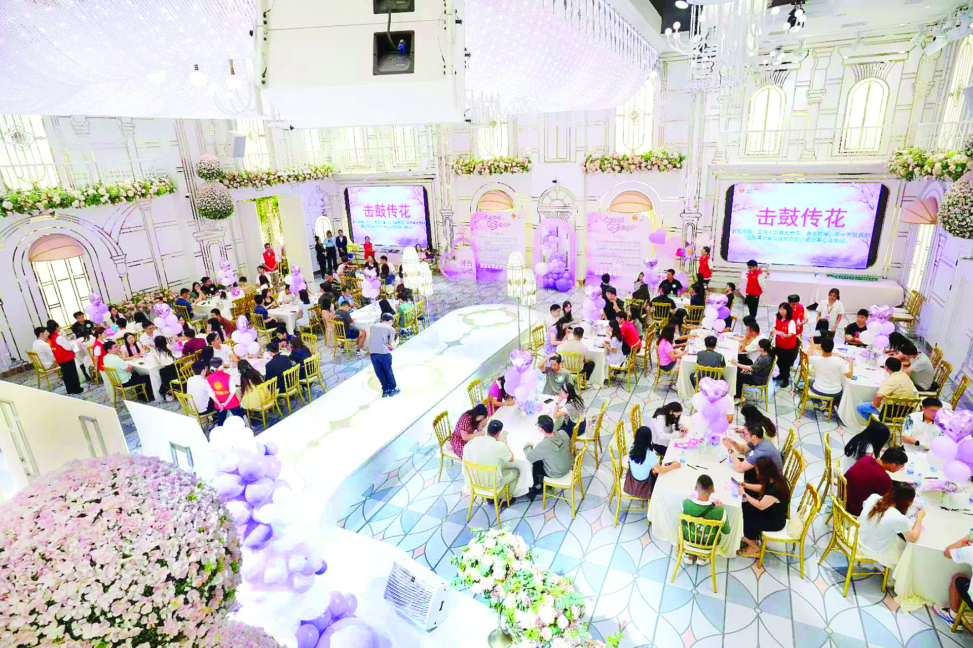 現(xiàn)場(chǎng)以鮮花和氣球精心裝點(diǎn),處處洋溢著浪漫氣息。在獨(dú)具特色的“桃花簽”簽到墻前,嘉賓們留下專屬印記,懸掛的個(gè)人資料卡如朵朵桃花綻放緣分的可能。