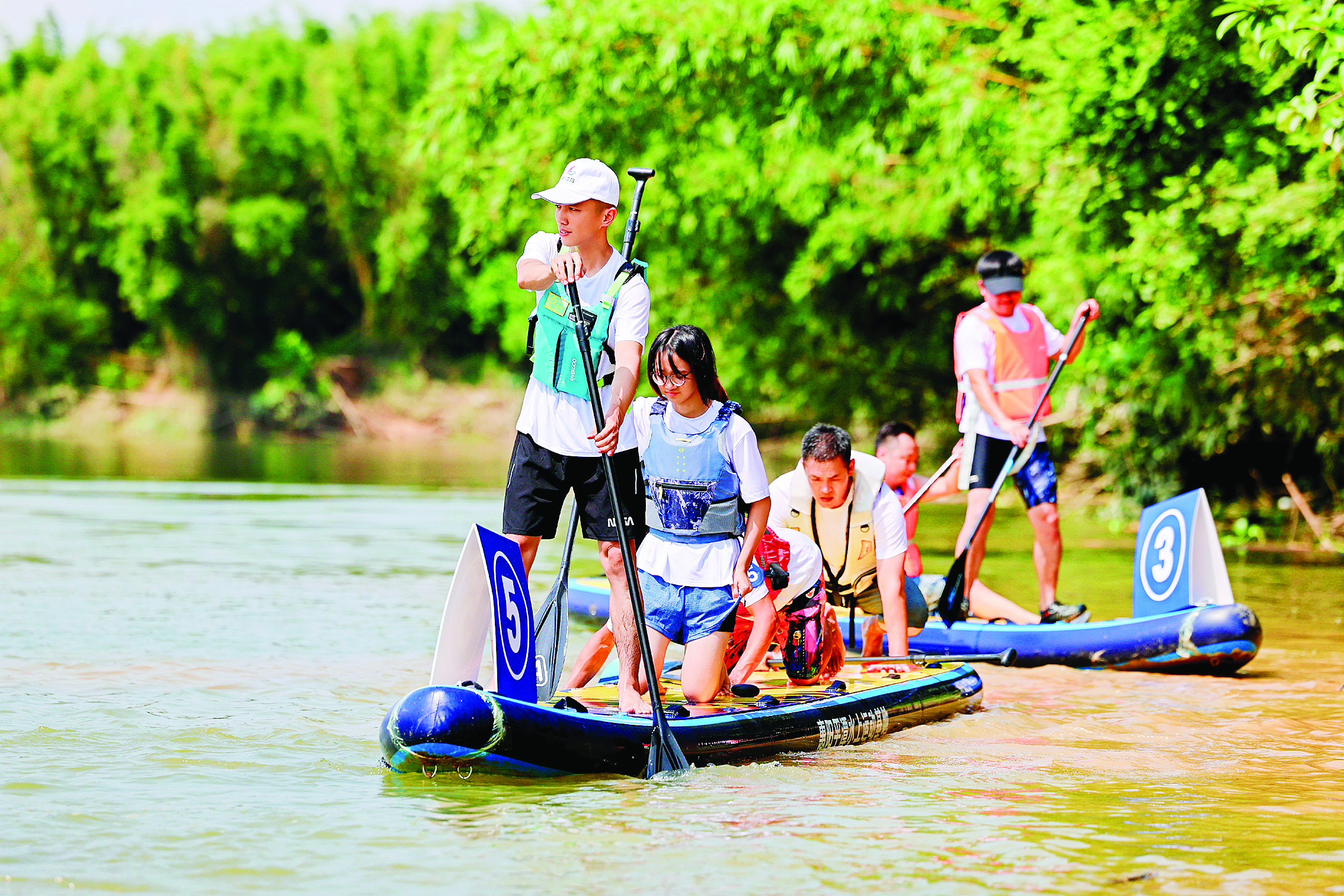 游客在平潭水上運動基地玩槳板。