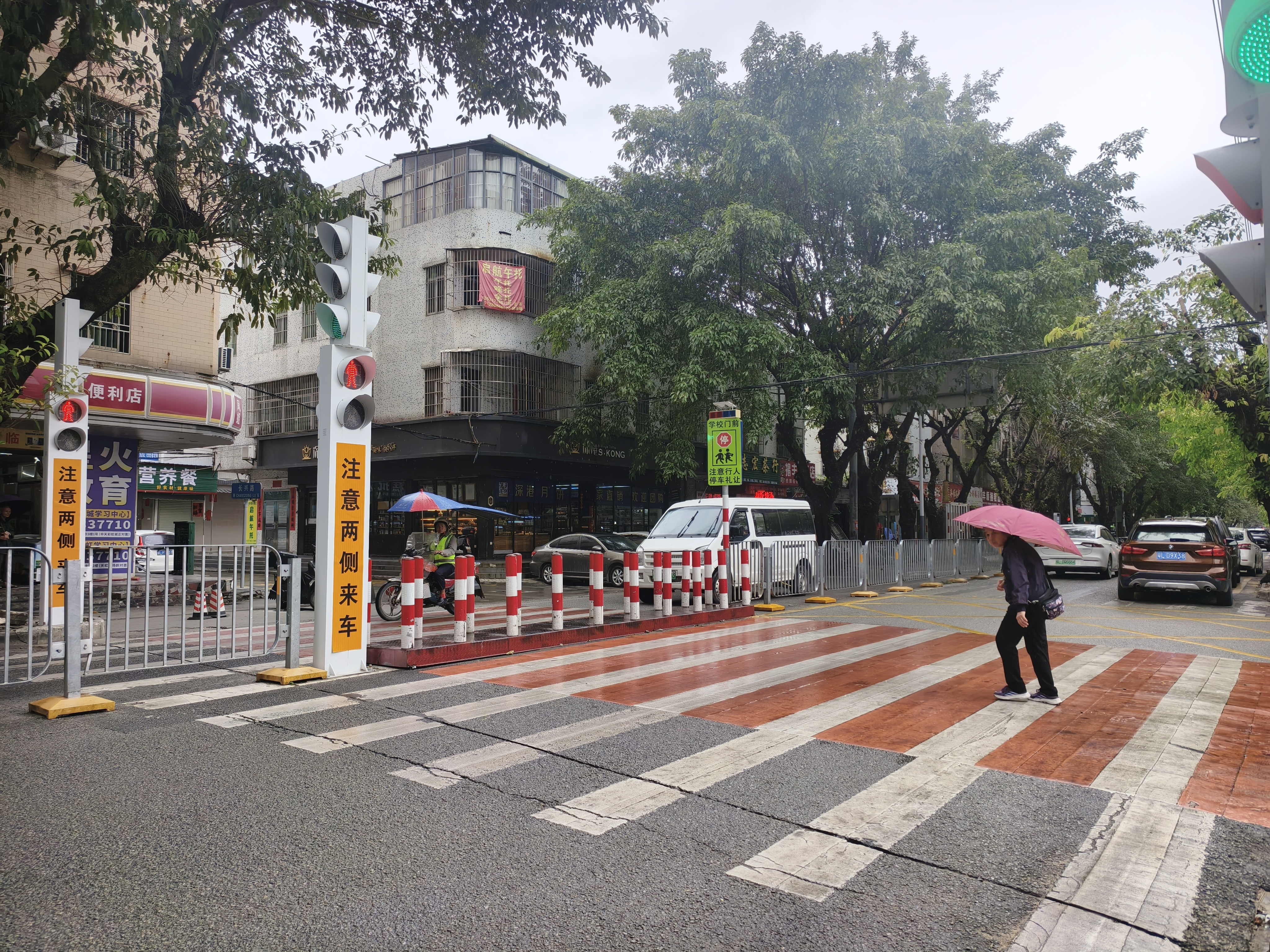 在惠陽半島學(xué)校門口,交警部門設(shè)置了懸掛式人行過街信號燈。該信號燈高懸于道路上空,視野開闊,便于機動車駕駛員遠距離辨識,從而能提前減速、做好停車讓行準(zhǔn)備。