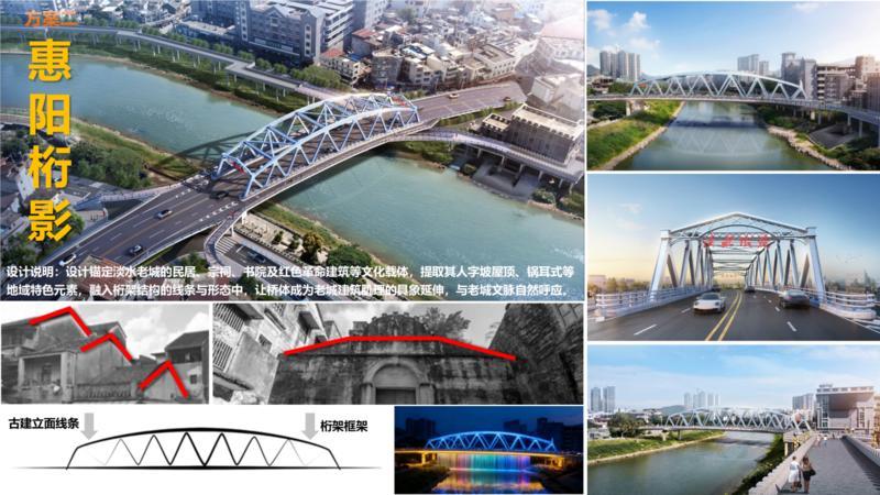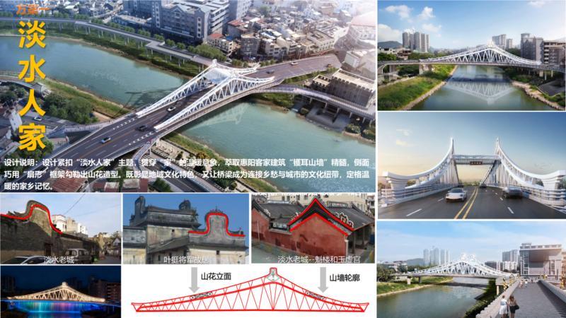 設(shè)計(jì)說明:設(shè)計(jì)錨定淡水老城的居民、宗祠、書院及紅色革命建筑等文化載體,提取其人字坡屋頂、鍋耳式等地域特色元素,融入桁架結(jié)構(gòu)的線條與形態(tài)中,讓橋體成為老城建筑肌理的具象延伸,與老城文脈自然呼應(yīng)。