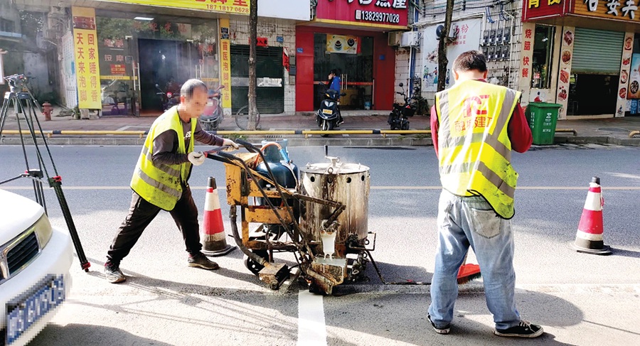 工作人員正在翻新停車位標(biāo)線。 惠州日報(bào)記者黃宇翔 通訊員龍融心 攝