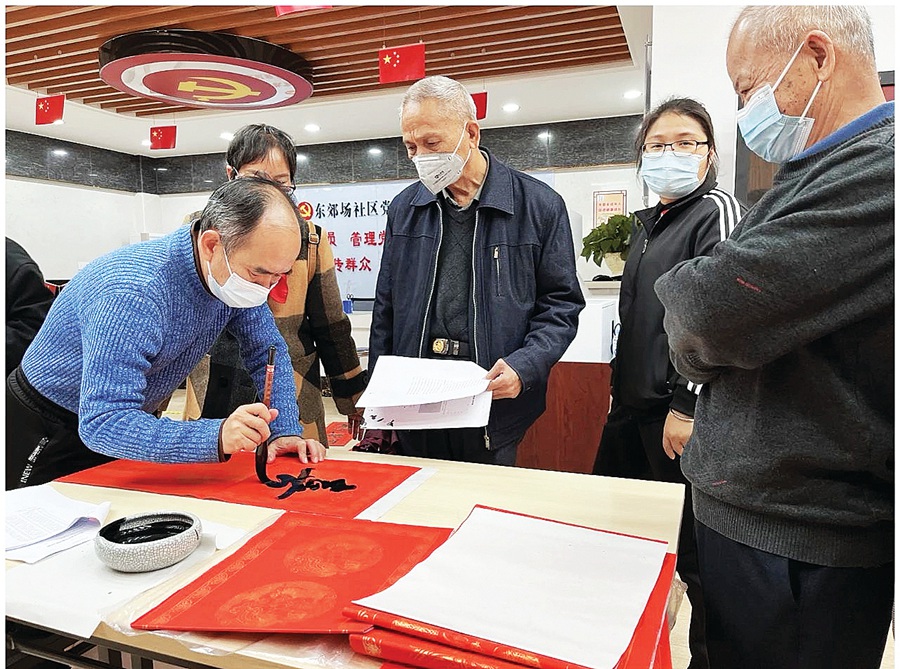 活動(dòng)現(xiàn)場,縣紀(jì)委書法愛好者揮毫潑墨,吸引不少群眾參與,紛紛邀請他們?yōu)樽约簩懸桓贝郝?lián),現(xiàn)場氣氛熱烈!拔医裉煸缭缇蛠砼抨(duì)了,送春聯(lián)活動(dòng)很有年味,收到這樣特別的春聯(lián)更開心!币晃蝗罕娬f道。
