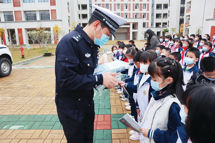 民警給學生派發(fā)交通安全宣傳小冊子。惠州日報記者黃宇翔 通訊員龍融心 攝