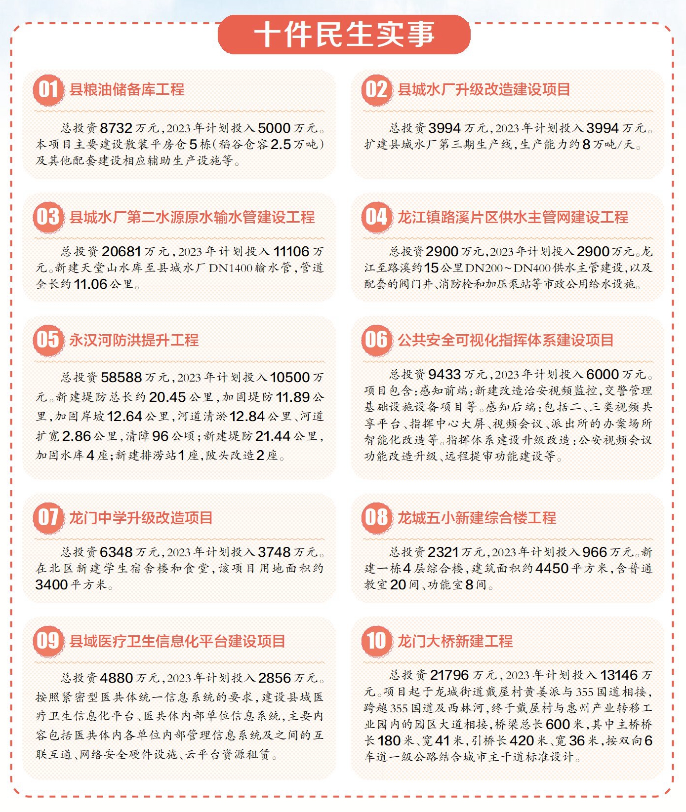 為進(jìn)一步增進(jìn)民生福祉,解決群眾急難愁盼問(wèn)題,使惠民實(shí)事更貼近群眾心愿,早前,根據(jù)龍門縣委、縣政府工作安排,按照“注重民生、量力而行、兌現(xiàn)承諾、當(dāng)年見效”的原則,龍門縣政府初步遴選出2023年縣級(jí)民生實(shí)事,整理形成《龍門縣2023年民生實(shí)事候選項(xiàng)目表》。近日,龍門縣十六屆人大四次會(huì)議上票選并公布了2023年龍門縣十件民生實(shí)事。十件民生實(shí)事涵蓋飲水、教育、醫(yī)療、交通、安全等多個(gè)領(lǐng)域,將進(jìn)一步增進(jìn)龍門群眾民生福祉、提升群眾幸福感。