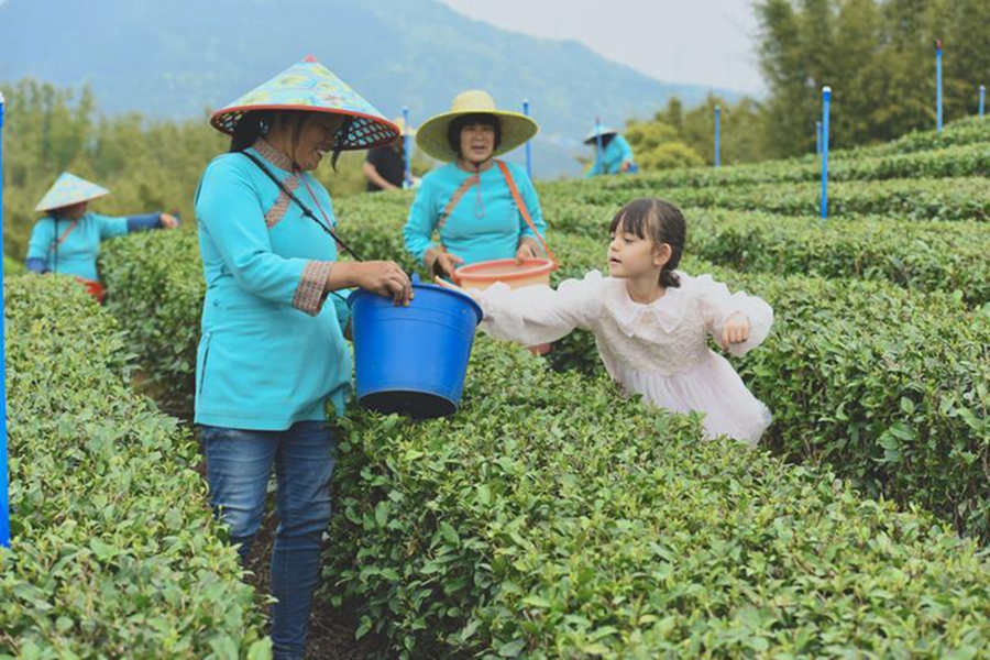 在采茶節(jié)活動現(xiàn)場,游客與茶農踏青采茶。