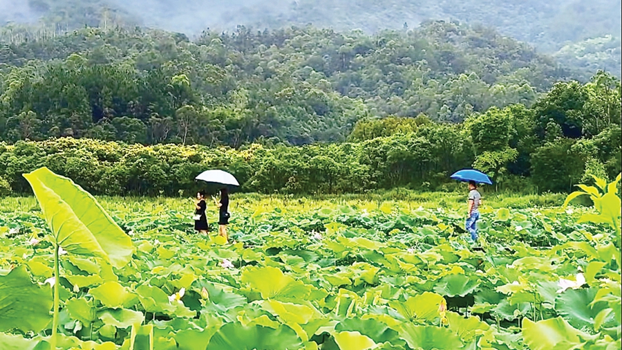 又到一年賞荷季。近期,龍門縣藍田瑤族鄉(xiāng)紅星村的百畝荷花相繼綻放,吸引了不少游客慕名前往觀賞。日前,記者來到紅星村“瑤鄉(xiāng)田園”荷花基地看到,連日來不時降水,為朵朵荷花披上了珠鏈。在雨水的洗禮下,荷花基地里的“夏雨荷”更添了幾分神韻和嬌美。