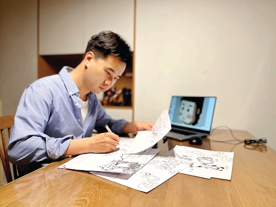 追夢的路上,鄒奮收獲了幸福的家庭。2015年,鄒奮和妻子潘美欣結(jié)婚,現(xiàn)育有兩子,一家四口其樂融融的日常,成了鄒奮創(chuàng)作的靈感來源。于是,鄒奮以身邊的親朋好友為原型,以美麗鄉(xiāng)村為舞臺,以自己的生活閱歷為腳本,開始創(chuàng)作動漫作品《藍天一家人》。