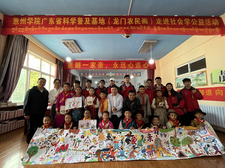 惠州學院廣東省社會科學普及基地(龍門農(nóng)民畫)公益活動日前在西藏林芝市朗縣中心小學舉行,舉辦了“漢藏一家親,攜手繪長卷”“漢藏同源茶畫會”和漢藏非遺故事繪等活動,架起一座連接漢藏友誼的藝術橋梁。這是“廣東文化名片”龍門農(nóng)民畫首次走進西藏交流展示。此次活動由惠州學院第十二批援藏支教師生組織開展,惠州學院美術與設計學院副院長吳冠聰、教師陳瑞綺和龍門農(nóng)民畫傳承人、美育導師鐘永廉帶領支教學生共同參與。