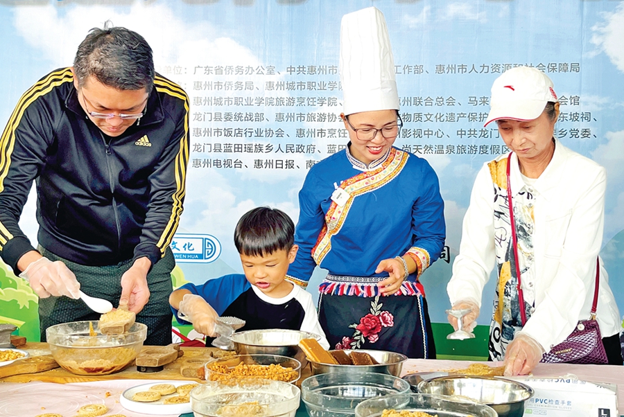 現(xiàn)場(chǎng)賓客與烹飪技師一同制作龍門米餅。惠州日?qǐng)?bào)記者黃宇翔 通訊員龍融心 攝