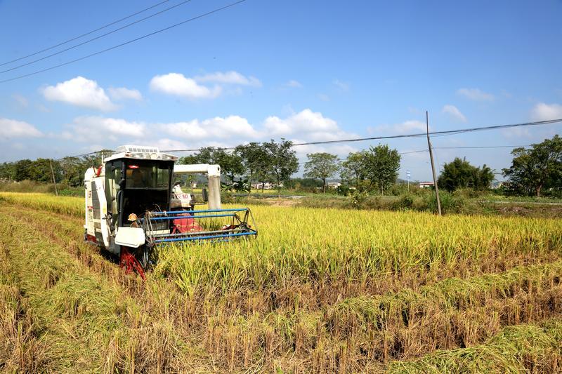 收割機(jī)在金色的稻田里來回穿梭;葜萑?qǐng)?bào)記者黃宇翔 特約通訊員黃偉光 攝