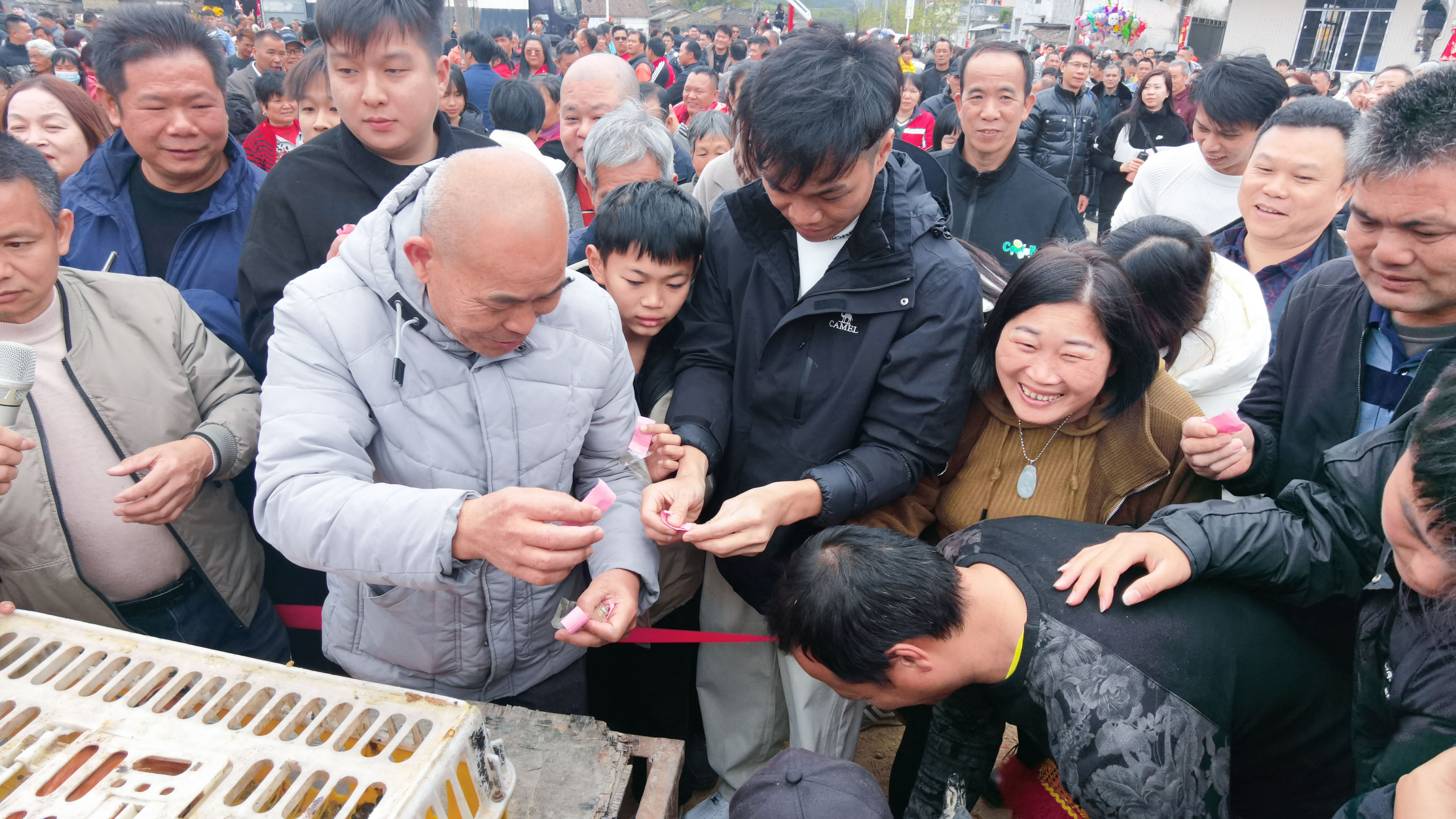 “啾—嘣”一聲,“炮頭”沖天而起,在空中劃過一道弧線飛向地面,參與者便一路歡笑拼命追炮、搶炮。隨著炮頭落下,一群人齊齊俯身搶拾,這一場面與橄欖球比賽的搶球畫面頗為相似。經(jīng)過一番激烈角逐,追炮搶炮的熱鬧場面結(jié)束,迎接大家的是兌換獎品的激動時刻。今年的獎品,主辦方準備了3只豬、10只鵝與20只雞,炮頭獲得者打開炮頭中夾帶的紙條,即可根據(jù)內(nèi)文所示兌換豐厚獎品。