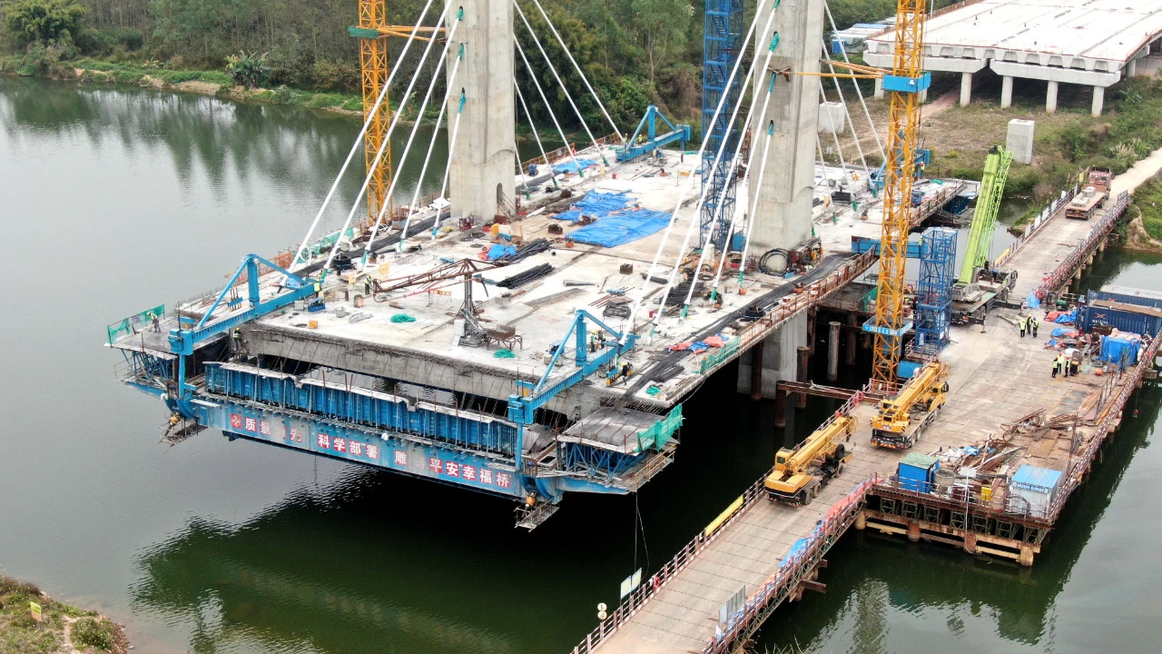 在龍門大橋新建項目現(xiàn)場,同樣是一派繁忙的景象。記者看到,大橋已經基本成形,施工人員正在進行主橋懸臂梁掛籃前移及鋼筋綁扎、引橋濕接縫、橫隔板施工等工作。