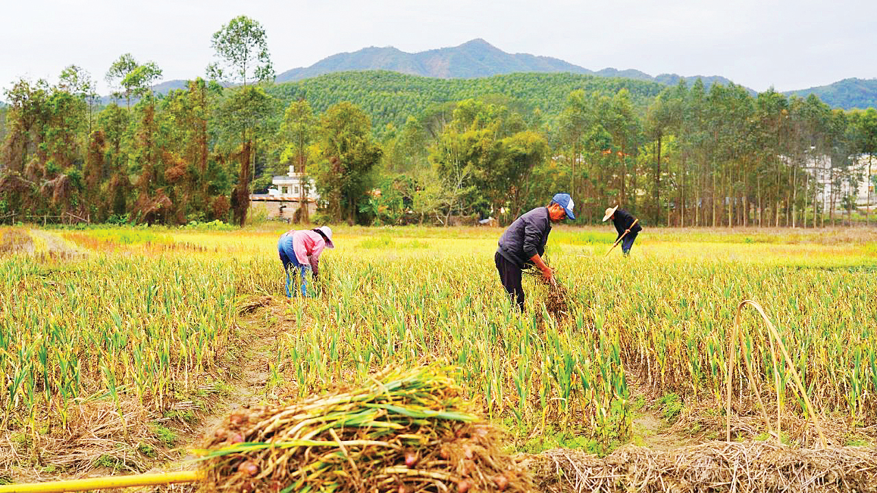 大圍村農(nóng)戶忙著采收大蒜。 惠州日?qǐng)?bào)記者黃宇翔 通訊員龍融心 攝