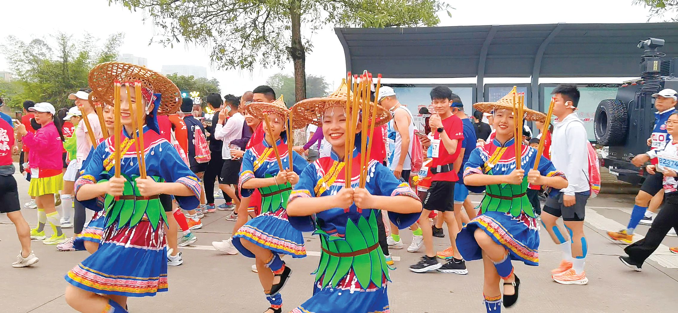為提升賽事趣味性和群眾參與性,龍門誠(chéng)意滿滿,實(shí)打?qū)崱俺业住绷。龍門農(nóng)民畫結(jié)合旗袍秀全新亮相,融合嶺南傳統(tǒng)與典雅時(shí)尚,綻放獨(dú)特魅力;近距離感受藍(lán)田舞火狗簡(jiǎn)樸獨(dú)特的舞姿,生動(dòng)展現(xiàn)瑤族文化的魅力。此外,盒籮舞、醒獅等龍門非遺也精彩亮相,為跑友、觀眾和游客呈現(xiàn)一場(chǎng)豐富多彩的非遺文化盛宴,展現(xiàn)龍門的活力與魅力,彰顯全民參與、共享運(yùn)動(dòng)的理念。