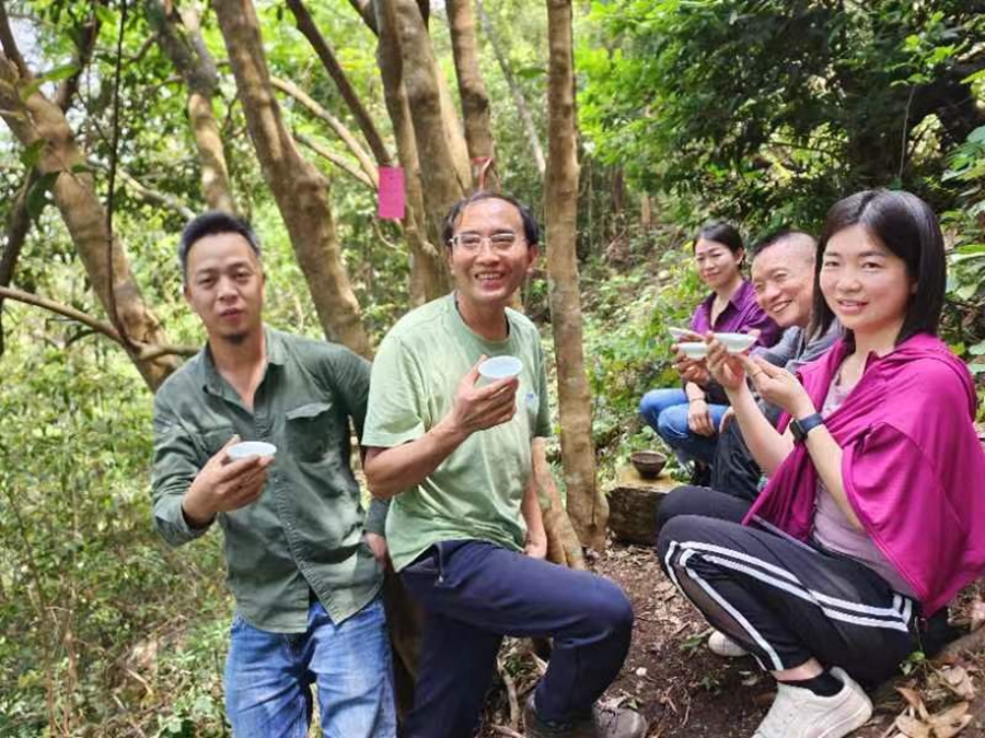 一路上,大家對古茶樹群落所在的地理環(huán)境、氣象氣候、周邊植物種群以及土壤等進行觀察分析,對古茶樹的分布情況、生長形勢和采摘條件等進行了調(diào)研,并嘗試采摘。