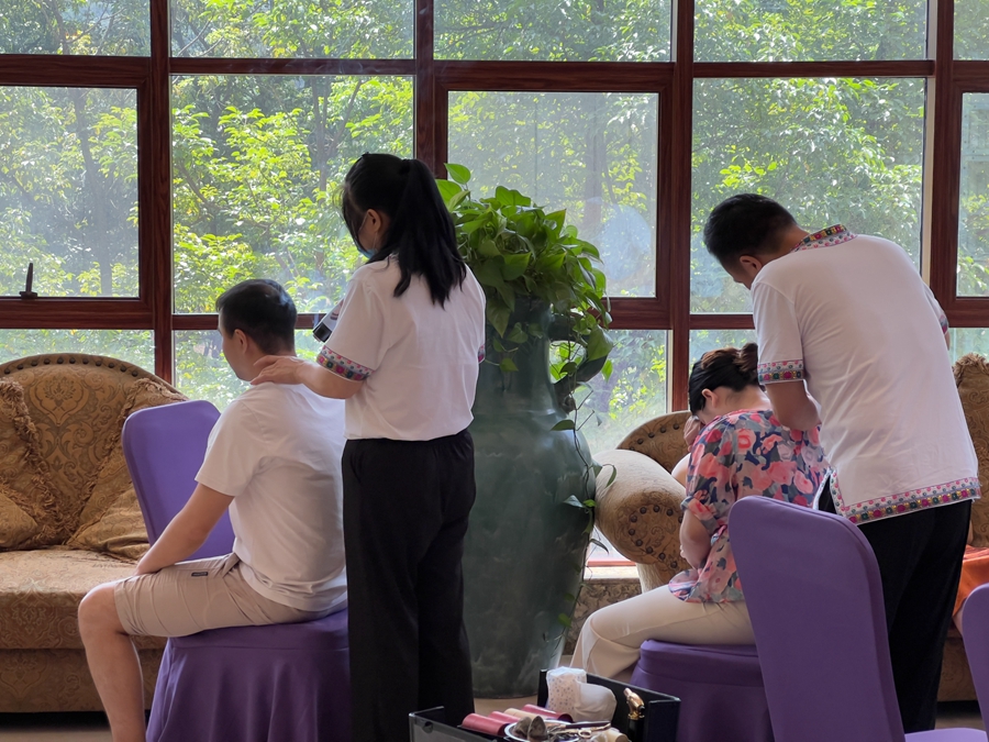 游客在溫泉景區(qū)內(nèi)體驗(yàn)艾灸。 惠州日?qǐng)?bào)記者黃宇翔 攝