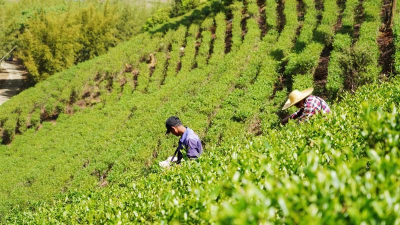 采茶工采摘鮮嫩茶芽;葜萑請(bào)記者黃宇翔 通訊員龍融心 攝