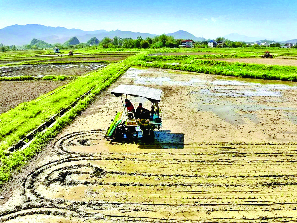 龍江鎮(zhèn)的田野上,農(nóng)戶正在機(jī)械化作業(yè)。
