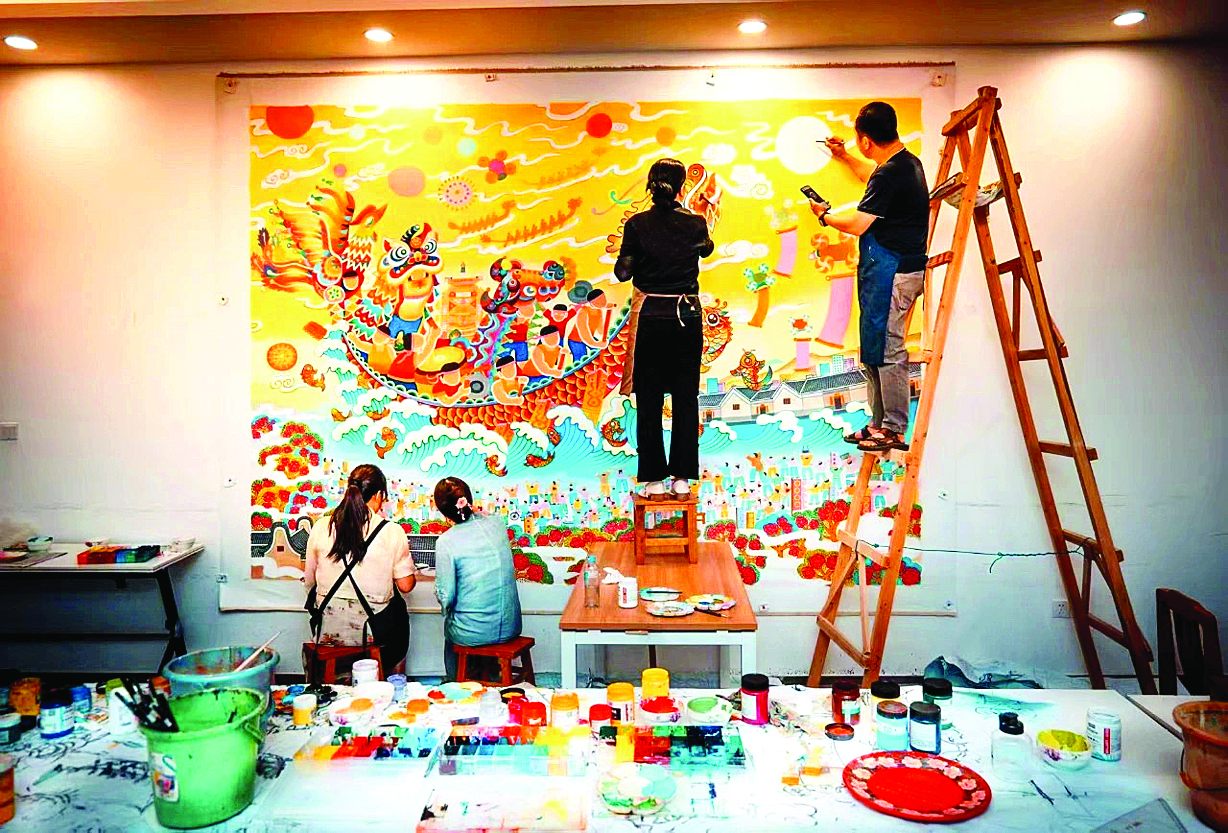 《潮涌南粵》是一幅長(zhǎng)3.5米、寬2.5米的巨型畫作,以濃烈的色彩和極具張力的構(gòu)圖,展現(xiàn)廣東龍門底蘊(yùn)深厚的民俗文化與新時(shí)代的蓬勃?dú)庀。畫作中,傳統(tǒng)嶺南元素與現(xiàn)代化符號(hào)交相輝映,激昂的賽龍舟、歡騰的舞春牛、雄健的醒獅、靈動(dòng)的舞鳳等民俗場(chǎng)景栩栩如生,與象征科技發(fā)展的無人機(jī)群、承載歷史記憶的鑊耳樓建筑融為一體,形成一幅跨越時(shí)空的鄉(xiāng)土畫卷。