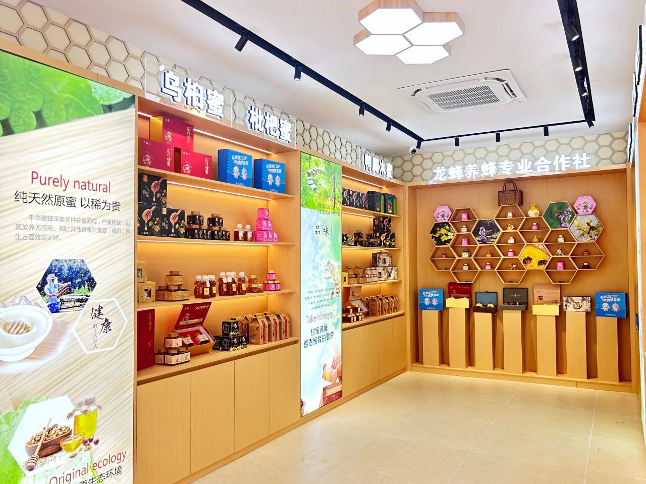 龍門縣養(yǎng)蜂研究所的展示區(qū),鴨腳木蜜、姜檸蜂蜜等產品整齊陳列。 惠州日報記者黃宇翔 通訊員龍融心 攝