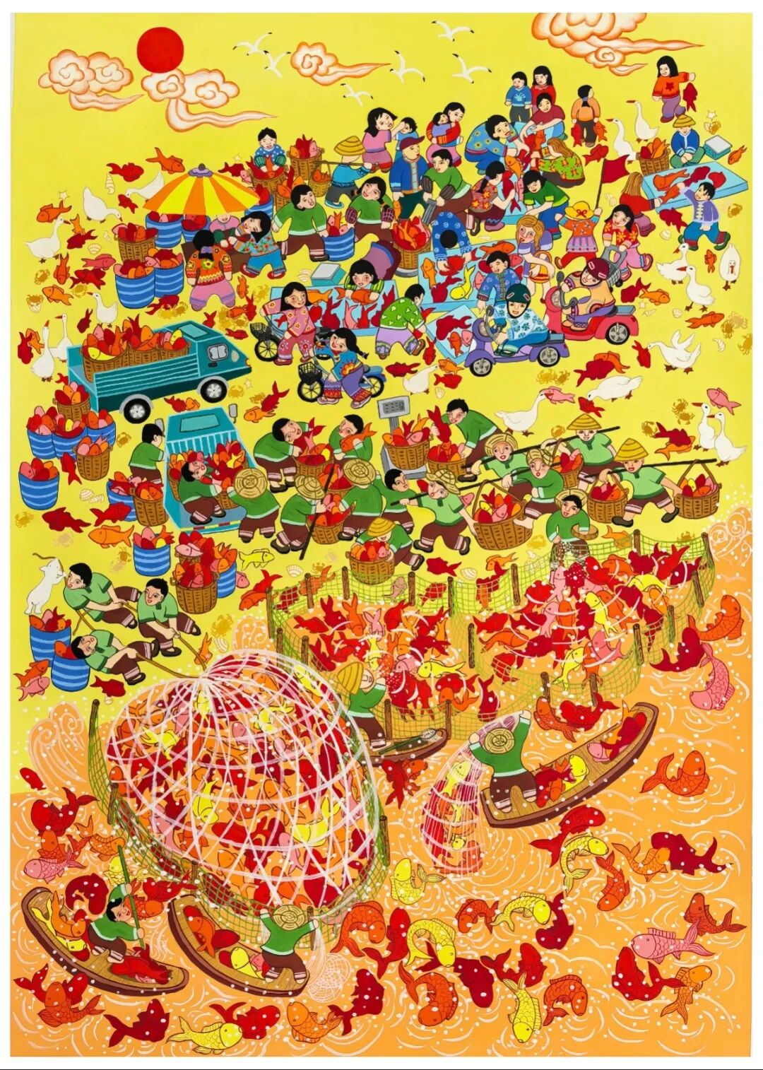 作為“中國現(xiàn)代民間繪畫畫鄉(xiāng)”“中國民間文化藝術(shù)之鄉(xiāng)”,龍門農(nóng)民畫多年來堅持以濃墨重彩記錄生活本真,用質(zhì)樸筆觸傳遞鄉(xiāng)土情懷。此次入選的4幅作品,延續(xù)了當(dāng)?shù)剞r(nóng)民畫色彩明艷、構(gòu)圖飽滿的藝術(shù)特色,既聚焦嶺南農(nóng)事節(jié)慶、漁鄉(xiāng)市集等傳統(tǒng)題材,又融入新時代鄉(xiāng)村振興的鮮活氣息,把勞動的喜悅、豐收的盛景和群眾對美好生活的向往,實實在在地畫在了紙上,成為嶺南民俗文化的生動寫照。