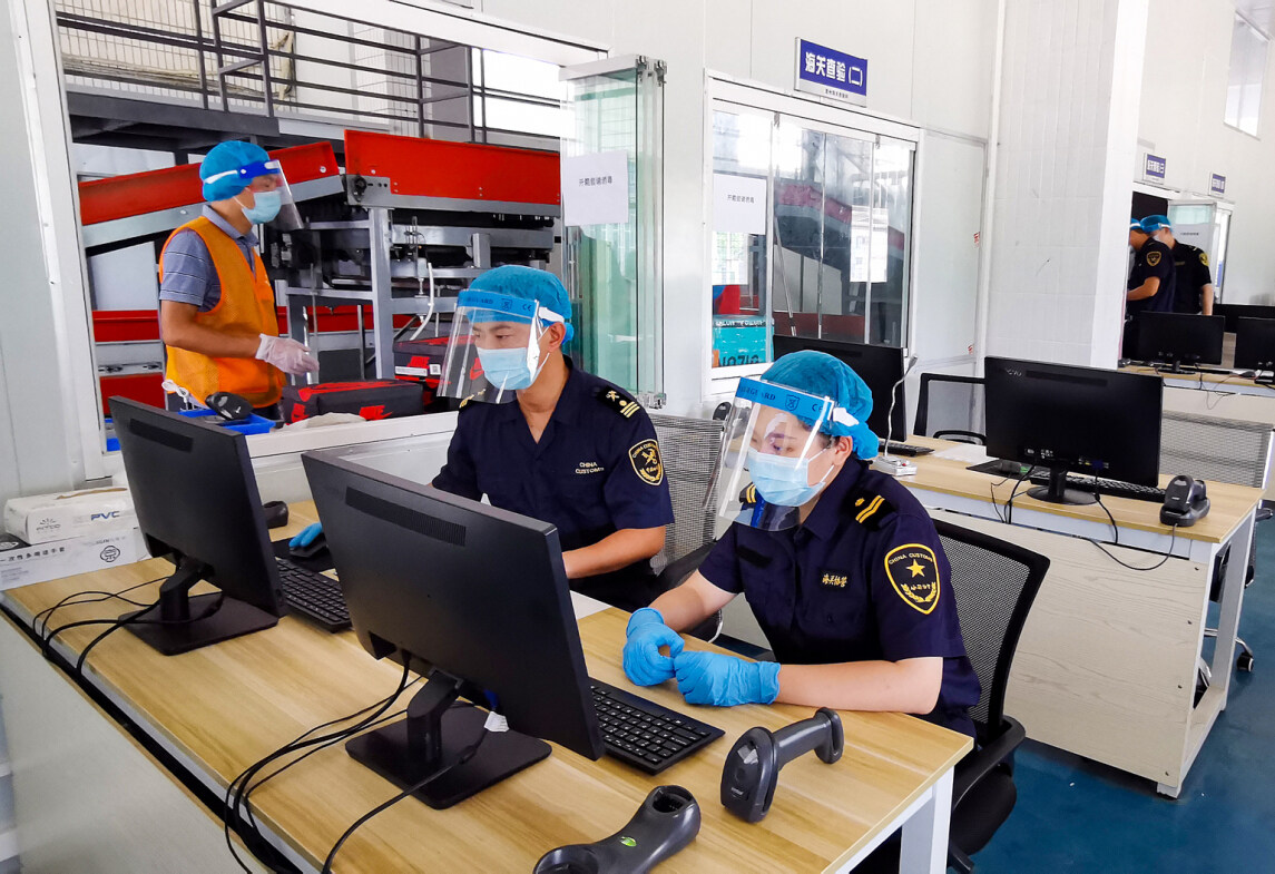 惠州海關(guān)關(guān)員對(duì)出口跨境電商貨物過(guò)機(jī)檢驗(yàn)。
