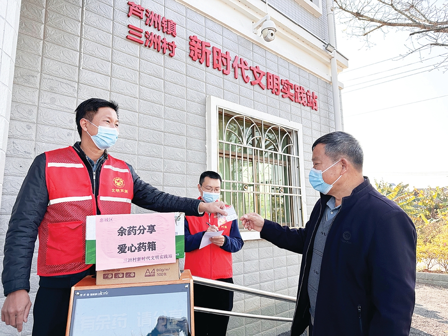 文明實(shí)踐站派發(fā)退燒藥。 惠州日?qǐng)?bào)記者香金群 通訊員廖詠琳 攝
