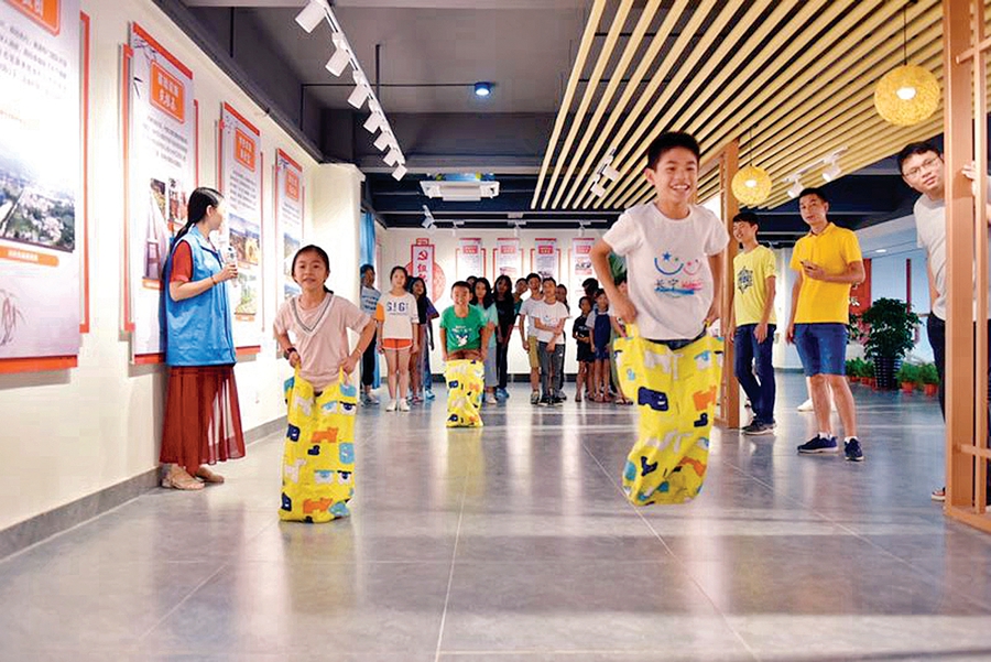 孩子們?cè)谛聲r(shí)代文明實(shí)踐場(chǎng)所開心游戲。