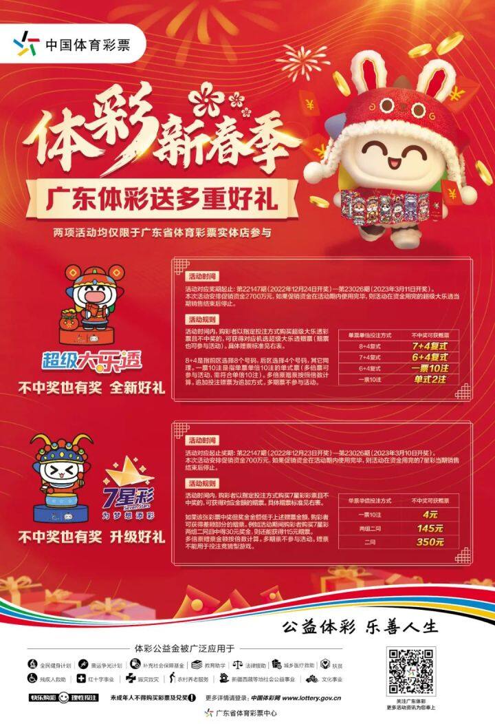“超級大樂透不中獎也有獎”是廣東體彩的經典活動,本次活動在大樂透第22147期(2022年12月24日開獎)至第23026期(2023年3月11日開獎)期間開展,安排活動資金2700萬元。如果活動資金提前使用完畢,則活動在資金用完的超級大樂透當期銷售結束后停止。