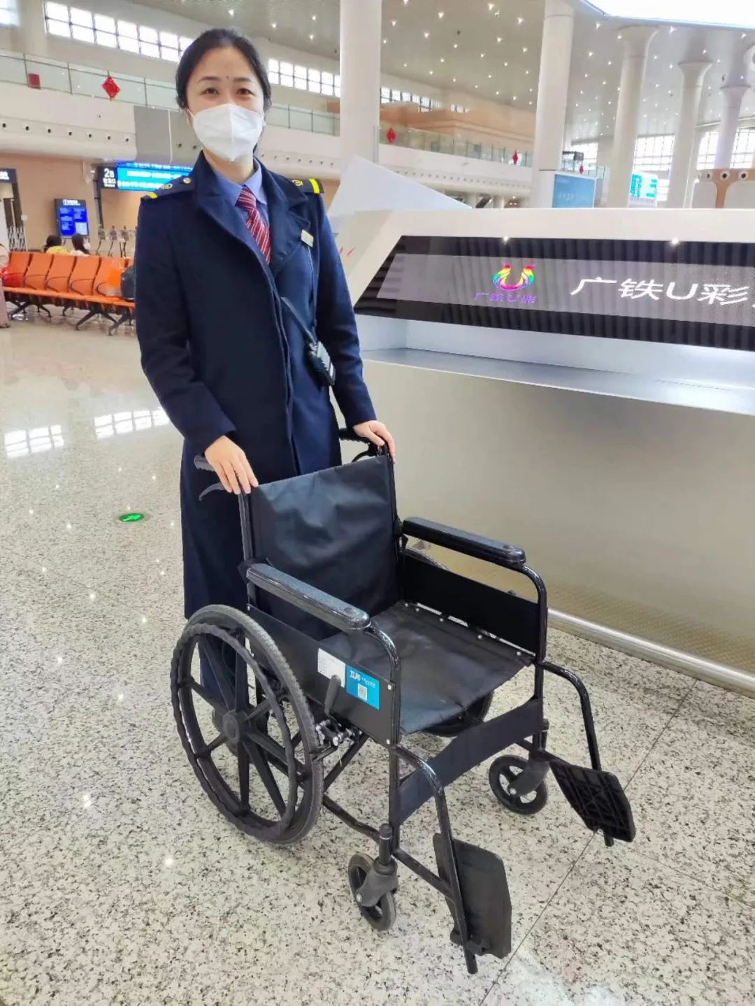 為滿足特殊重點(diǎn)旅客出行需求,惠州北站與團(tuán)市委聯(lián)手開(kāi)展了志愿幫扶服務(wù),在售票廳、檢票口、服務(wù)臺(tái)設(shè)置志愿服務(wù)隊(duì),為特殊重點(diǎn)旅客提供全鏈條、全過(guò)程愛(ài)心服務(wù)。其中,站內(nèi)設(shè)置了兩臺(tái)輪椅,可為行動(dòng)不便的旅客,提供免費(fèi)服務(wù)。謝林珂:“惠州北站是有設(shè)置輪椅的,比如說(shuō)有一些旅客行動(dòng)不便,可以打12306預(yù)約,或者到現(xiàn)場(chǎng)跟我們工作人員提出相應(yīng)的訴求,然后我們會(huì)推輪椅到進(jìn)站口,將旅客迎接進(jìn)站,然后核對(duì)完旅客出行的車次,送達(dá)列車車廂門(mén)口跟列車長(zhǎng)進(jìn)行交接。并且和列車長(zhǎng)交接完之后,我們也會(huì)通知到站那邊的客運(yùn)服務(wù)人員,進(jìn)行一個(gè)延伸服務(wù),到站也可以提供輪椅,把旅客接送出站,交給他的那個(gè)接站的家屬!