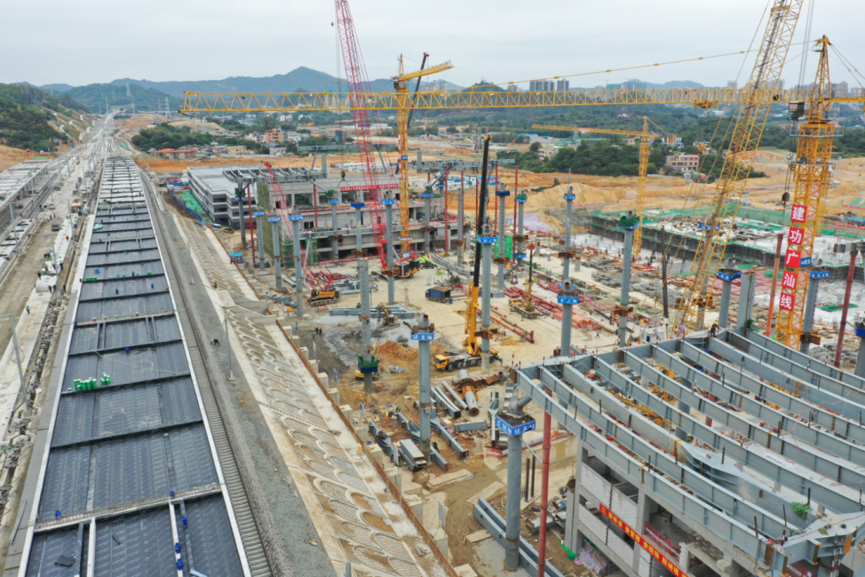 廣汕鐵路惠州南站施工現(xiàn)場。記者了解到,站房A、C區(qū)主體封頂完成,砌體結(jié)構(gòu)完成85%,鋼結(jié)構(gòu)吊裝完成30%,站臺雨棚主體完成95%,生產(chǎn)生活用房完成50%。據(jù)介紹,目前站房鋼結(jié)構(gòu)屋蓋鋼梁已開始吊裝,計劃2月完成吊裝。