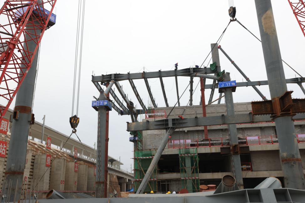 施工人員吊裝鋼梁。作為沿線重要站點,惠城南站由國內(nèi)知名專家設(shè)計,設(shè)計理念是“重檐疊瓦、麟紋漾波”,充分展示了嶺南古村落文化中的美學(xué)意境和根源于古老農(nóng)耕文化的居住情調(diào),如旭日村、范和村、墨園村、功武村等。利用重復(fù)的弧形單元頂棚,勾勒出極具陣列感的建筑輪廓,形似嶺南古村落層層疊疊的屋頂肌理。