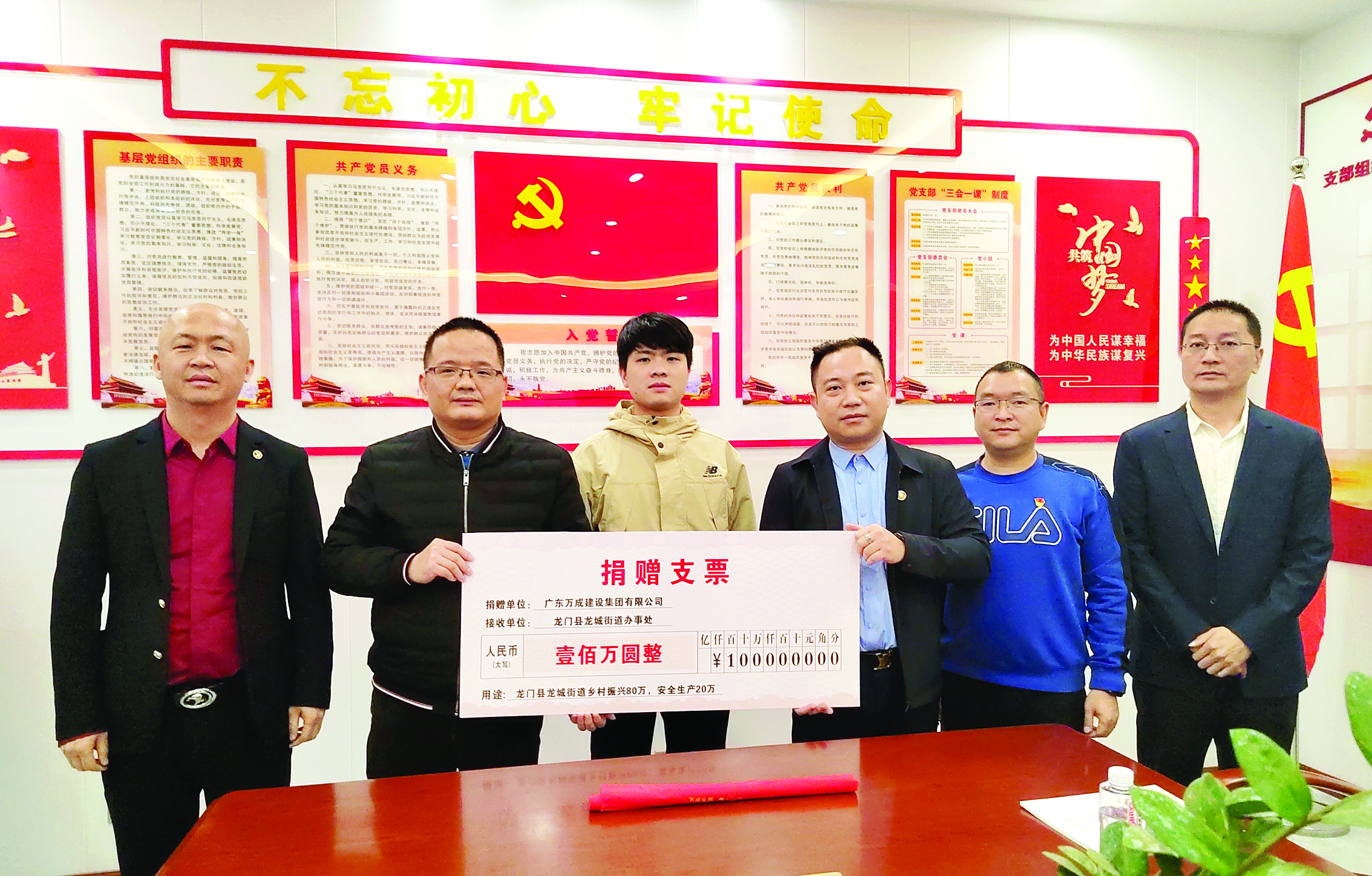 廣東萬(wàn)成建設(shè)集團(tuán)有限公司法人代表潘曉志、廣東萬(wàn)成建設(shè)集團(tuán)有限公司常務(wù)副總經(jīng)理林耿薪、浙江鯤鵬建設(shè)集團(tuán)總經(jīng)理趙金龍、中灣工程設(shè)計(jì)有限公司總經(jīng)理葉春蔚以及龍門(mén)縣龍城街道辦事處相關(guān)負(fù)責(zé)人等一行10余人參加捐贈(zèng)儀式。