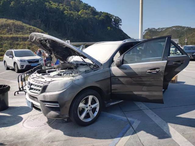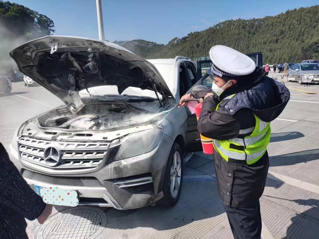 1月18日,在通驛粵東分公司所轄紫惠高速橫瀝停車區(qū)(往揭陽方向),一輛停放的奔馳車車頭突然著火。緊急關頭,交通協(xié)管隊員化身消防員,3分鐘就把火撲滅了。
