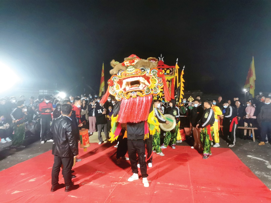 放完開門炮、上完頭炷香,也是“睇虎獅”的時刻,觀賞金獅獻瑞表演。村中的宗祠、媽祖廟門前,幾乎每年都有人舞獅。今年適逢疫情政策優(yōu)化調(diào)整,舞獅特別應(yīng)景。我在路上遇見一個大約二三十人的獅班進村參拜,他們舉著旗幟、敲著鑼鼓走向宗祠,準(zhǔn)備觀看表演的村民們一路跟著,隊伍浩浩蕩蕩。年初一當(dāng)天,有來自汕尾地區(qū)三個不同村莊的獅班,同時來到村中的廟宇表演、參拜。