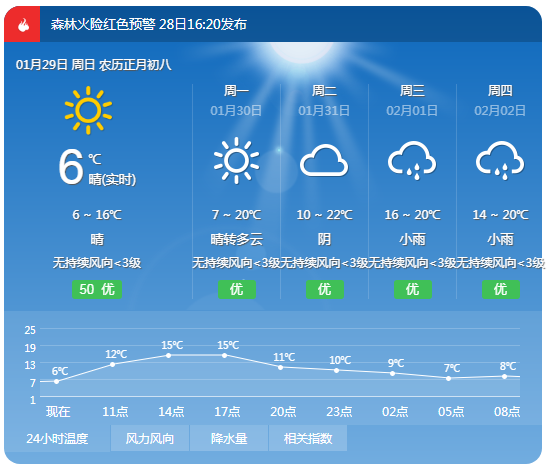 值得關(guān)注的是,受冷空氣影響,多個縣(區(qū))1月28日將寒冷預(yù)警信號升級為橙色,提醒大家繼續(xù)做好防御工作。據(jù)市氣象臺預(yù)計(jì),1月29~30日,我市各地晴天間多云,北部和東部山區(qū)局部有霜凍,最低氣溫3~6℃,日間氣溫逐日回升;1月31日,多云到陰天,云量逐漸增多,氣溫9~20℃;2月1~4日,陰天間多云,有零星小雨,早晚有(輕)霧,氣溫14~21℃。