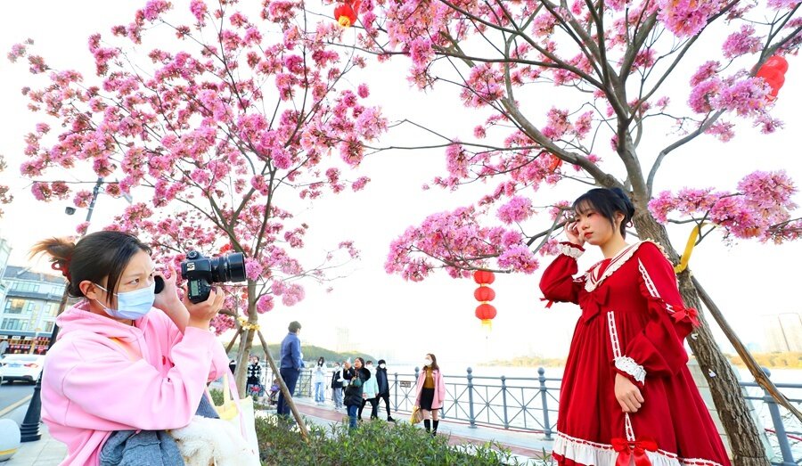 1月31日,在冬日暖陽(yáng)下,陸陸續(xù)續(xù)有市民來(lái)打卡,邂逅浪漫的紫花風(fēng)鈴。走近紫花風(fēng)鈴木,只見(jiàn)滿樹(shù)枝頭都是一簇簇紫紅色的花朵,整株樹(shù)幾乎沒(méi)有葉片,猶如編織了一個(gè)紫色的風(fēng)鈴。漫步其中,讓人在冬天里享受春天的感覺(jué)。
