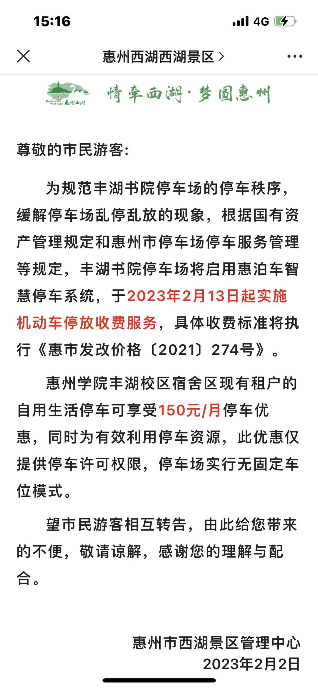 為規(guī)范豐湖書院停車場(chǎng)的停車秩序,緩解停車場(chǎng)亂停亂放的現(xiàn)象,根據(jù)國有資產(chǎn)管理規(guī)定和惠州市停車場(chǎng)停車服務(wù)管理等規(guī)定,豐湖書院停車場(chǎng)將啟用惠泊車智慧停車系統(tǒng),于2023年2月13日起實(shí)施機(jī)動(dòng)車停放收費(fèi)服務(wù),具體收費(fèi)標(biāo)準(zhǔn)將執(zhí)行《惠市發(fā)改價(jià)格〔2021〕274號(hào)》。