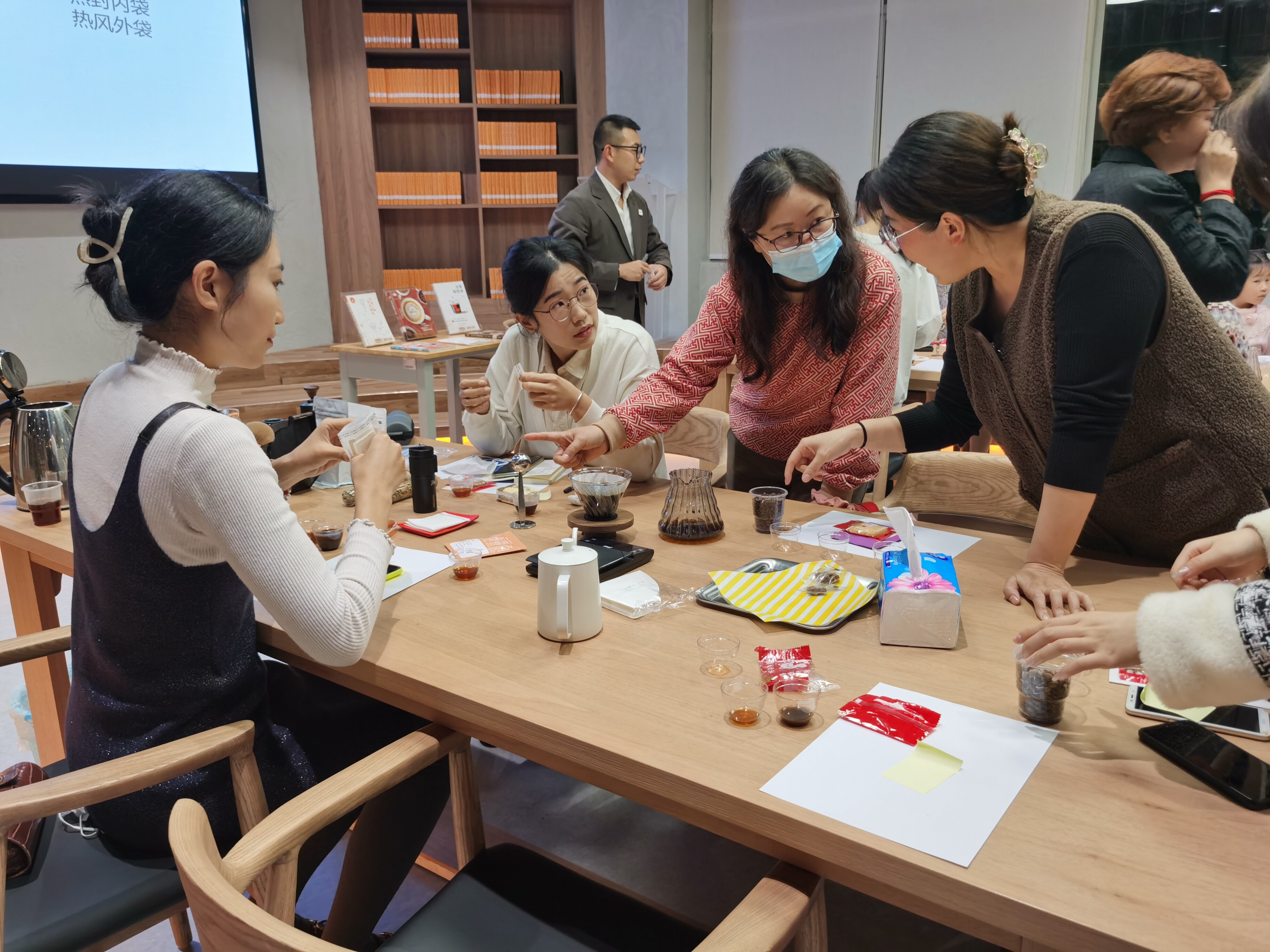 室內(nèi)的淡黃色燈光營造出中溫馨、淡雅的氛圍,主辦方邀請CQl國際咖啡品質(zhì)鑒定協(xié)會認證咖啡品質(zhì)鑒定師阿龍現(xiàn)場授課,通過講解、展示、體驗、互動、品鑒等方式,帶領(lǐng)活動參與者走入了一場跨越時空的咖啡之旅,通過文化與美味的交流,碰撞出別樣的感官新體驗;顒蝇F(xiàn)場還為市民推薦《冷萃咖啡學(xué)》《烘一杯好咖啡》《咖啡拉花》等十幾種咖啡主題的圖書,市民不時翻閱相關(guān)圖書,和同伴低聲交流分享心得。