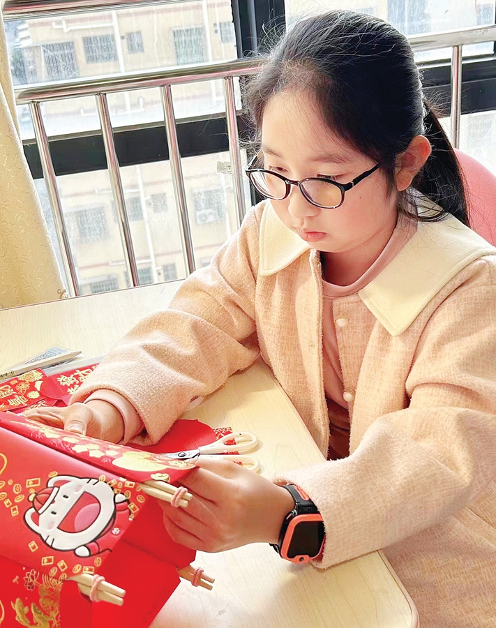 不少學(xué)校的寒假德育實(shí)踐作業(yè)設(shè)計了春節(jié)主題。惠州市惠城區(qū)德威江譽(yù)誠小學(xué)讓孩子們動手寫春聯(lián),幫助父母貼春聯(lián);或做新年賀卡,寫上對親人美好的祝福語……該校五(1)班的陳毓瀅就用“利是包”做了個紅燈籠。