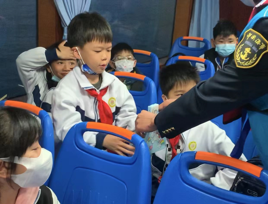 “請(qǐng)同學(xué)們有序排隊(duì),注意乘船安全哦!鼻宄6點(diǎn),惠州海事局青年志愿者們已乘坐海巡船艇早早來(lái)到大亞灣東升島,在渡口現(xiàn)場(chǎng)協(xié)助維護(hù)學(xué)生乘船秩序,向?qū)W生們發(fā)放“珍愛生命,遠(yuǎn)離非法船舶”單頁(yè)和“水上交通安全教育讀本”等宣傳資料。乘渡期間,海事志愿者為學(xué)生們帶來(lái)了一堂別開生面的水上安全知識(shí)小課堂,通過淺顯易懂的圖片、文字和案例為學(xué)生們講解乘船知識(shí)和水上事故逃生安全常識(shí),并示范指導(dǎo)如何正確穿戴救生衣,叮囑學(xué)生們注意乘船安全。課堂上志愿者們還結(jié)合水上安全知識(shí)開展知識(shí)競(jìng)答活動(dòng),并為同學(xué)們送上鉛筆、筆記本等文具用品,同學(xué)們踴躍參與,氣氛熱烈。