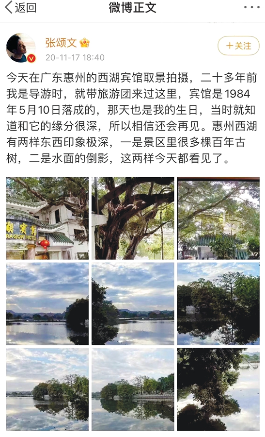 “今天在廣東惠州的西湖賓館取景拍攝,二十多年前我當(dāng)導(dǎo)游時(shí),就帶旅游團(tuán)來過這里。賓館是1984年5月10日落成的,那天也是我的生日,當(dāng)時(shí)就知道和它的緣分很深,所以相信還會再見;葜菸骱袃蓸?xùn)|西印象極深,一是景區(qū)里很多棵百年古樹,二是水面的倒影,這兩樣今天都看見了。”2020年11月17日,張頌文在《掃黑決戰(zhàn)》拍攝期間,發(fā)微博表達(dá)了自己的感慨,字里行間,對惠州的秀美景色諸多贊賞。