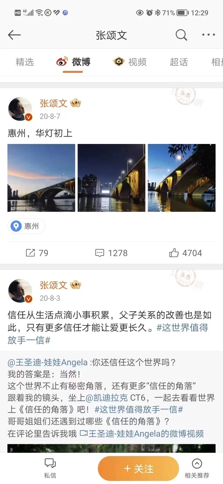 張頌文曾多次發(fā)微博為惠州西湖、惠州夜景、惠州工業(yè)文化代言。 網(wǎng)絡(luò)截圖