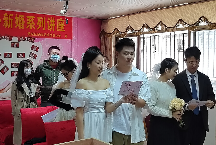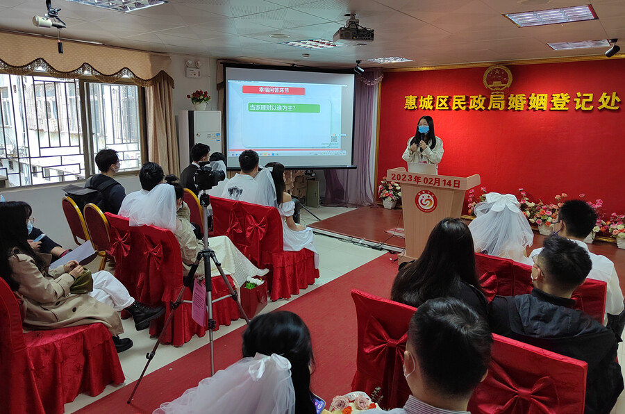 惠州日報(bào)訊 (記者陳春惠)人間自是多歡喜,共度余生路漫漫。2月14日,在這個(gè)特殊的時(shí)間節(jié)點(diǎn),惠城區(qū)婚姻登記處迎來了新人登記結(jié)婚的小高峰,130對新人攜手步入婚姻殿堂。為了滿足新人結(jié)婚登記需求,惠城區(qū)民政局為新人開展了系列婚姻講座并為新人集體頒發(fā)結(jié)婚證。當(dāng)天,我市各縣(區(qū))民政局婚姻登記處同步舉行集體頒證儀式,全市共有400多對新人集體登記領(lǐng)證。