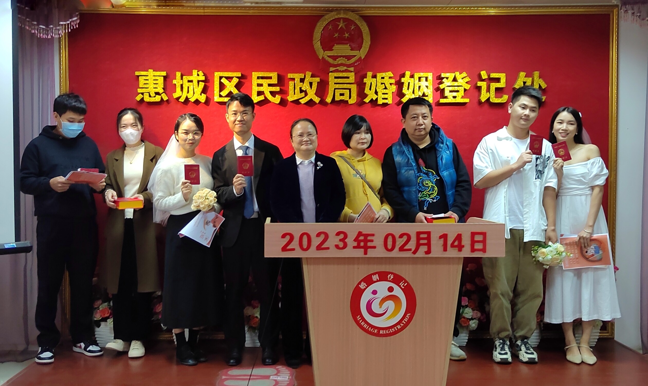 2月14日,惠城區(qū)婚姻登記處共為130對新人辦理婚姻登記。記者從市民政局了解到,當(dāng)天惠州各縣(區(qū))民政局婚姻登記處同步舉行集體頒證儀式,全市共有400多對新人集體登記領(lǐng)證。