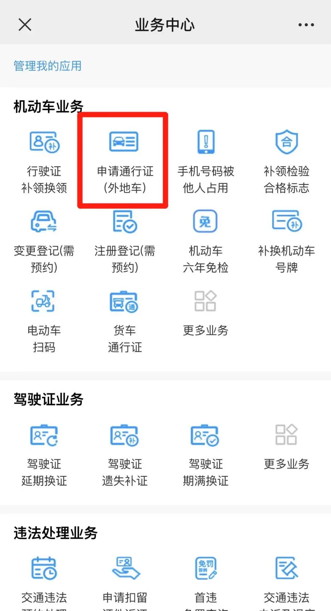 4、選擇機(jī)動(dòng)車業(yè)務(wù)中的“申請(qǐng)通行證(外地車)”;