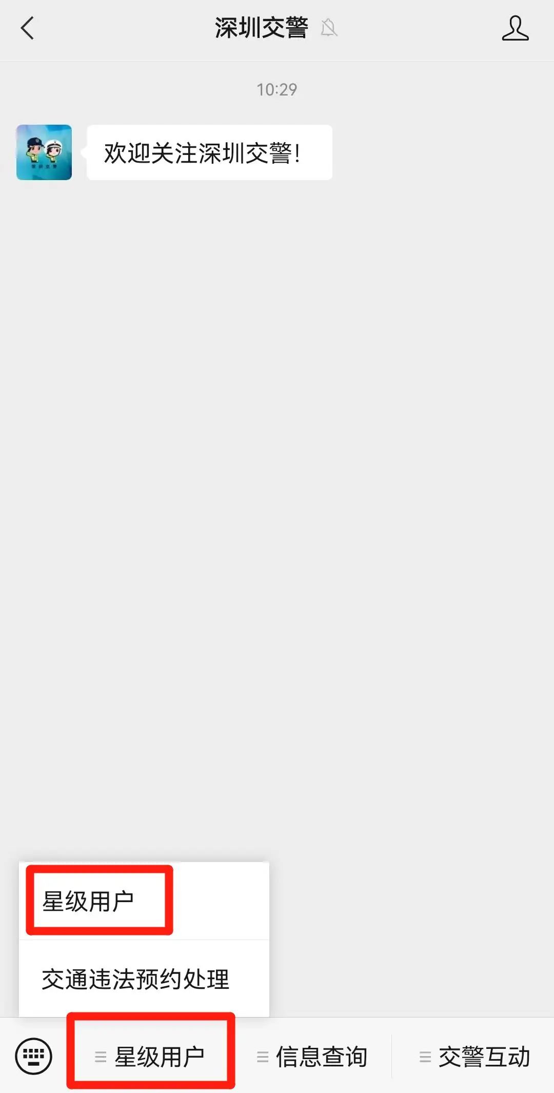 1、微信搜索“深圳交警”公眾號(hào),點(diǎn)擊菜單欄“星級(jí)用戶”;